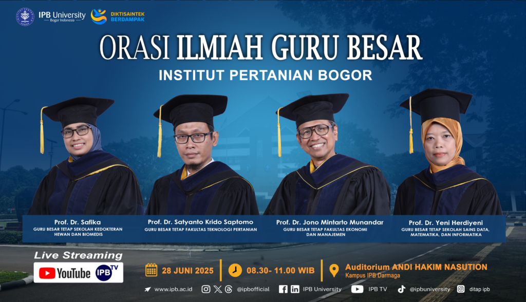 Sidang Terbuka Institut Pertanian Bogor dengan acara khusus Orasi Ilmiah Guru Besar pada hari Sabtu, 28 Juni 2025 menghadirkan empat guru besar dengan masing-masing judul orasi yang akan disampaikan sebagai berikut: